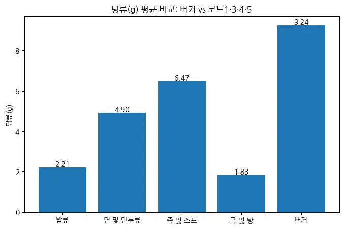 또, 최근 식품 트렌드에서 저속노화(anti-aging)와 관련된 저당이 핵심 포인트라 판단해, 버거의 당류 함량이 전체 식품군에서 어느 정도인지 분석해보았다.