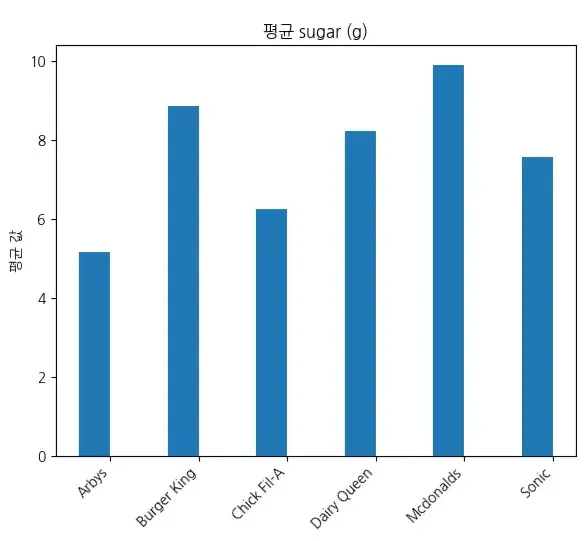 다른 식품군에 비해 당류가 가장 높은 결과를 보였고, 타 브랜드에 비해 맥도날드의 당류가 가장 높은 결과를 보였다.