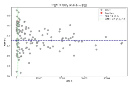face gym 브랜드 포지셔닝(리뷰 수vs 평점)