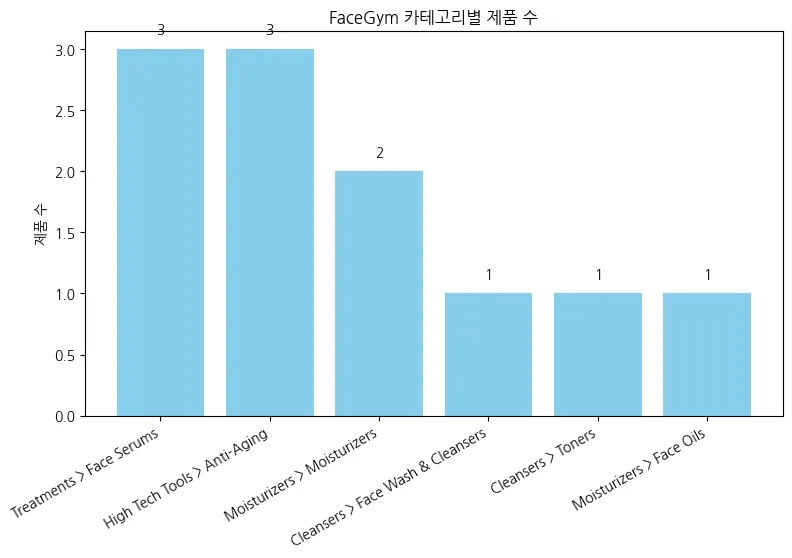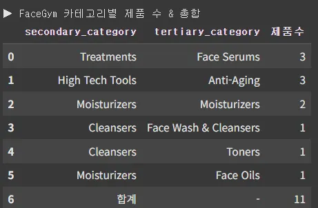 face gym 카테고리별 제품수 및 총계수