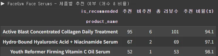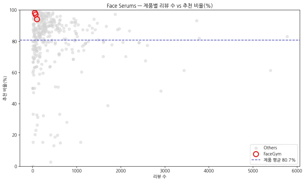 FACE GYM - 제품 별 리뷰수 vs 추천 비율