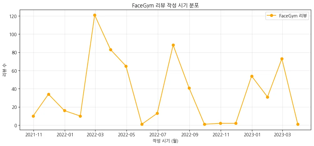 전체 리뷰 작성 시기 분포 및 페이스짐 단독