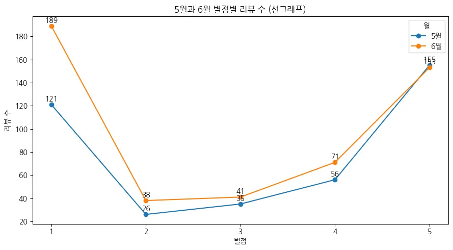 평균 맛별점이 6월에 2점대로 떨어졌다.