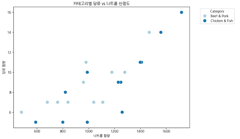 이는 나트륨이 높을수록 당도 함께 높아지는 패턴이 존재함을 의미합니다. 따라서 단순히 한 요소만 줄이는 접근보다는 당과 나트륨을 동시에 저감한 옵션 개발이 필요하며, 이는 건강 트렌드와 부합하는 차별적 경쟁력이 될 수 있습니다.