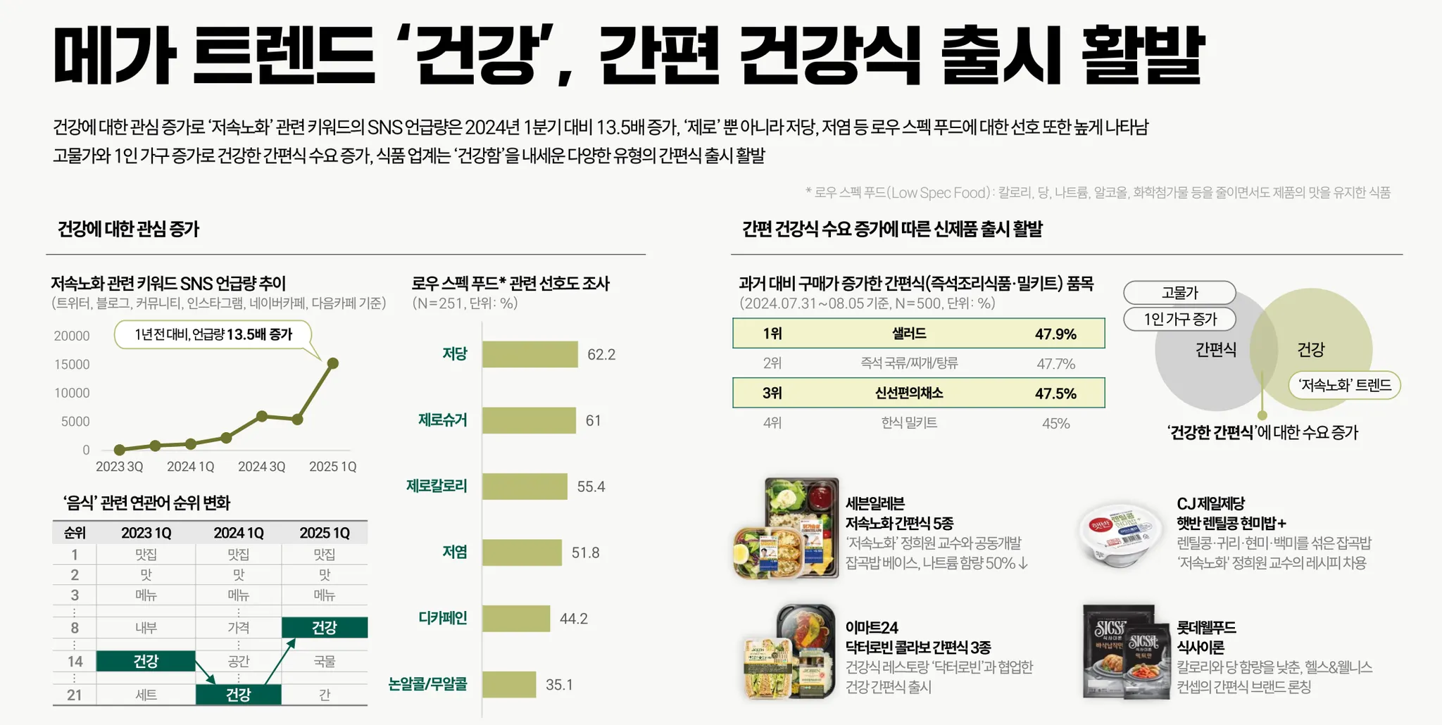 단순당과 초가공식품을 줄여 건강수명을 늘리려는 저속노화 식단 유행이 오래 지속되면서, 식품·유통업계가 저당·무설탕(제로슈거) 제품군을 기존의 간식·음료에서 양념류, 육가공품까지 확대하고 있다.