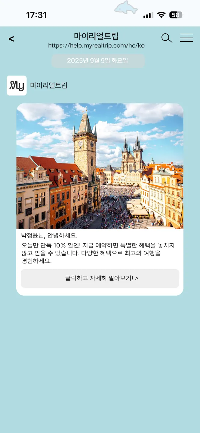 채널: 카카오톡 (이유: 앱 푸시 알림과 카카오톡에 내용이 남아 고객들이 확인하기 편리. 관광지 이미지와 링크까지 첨부돼있어 구매 유도에 효과적)