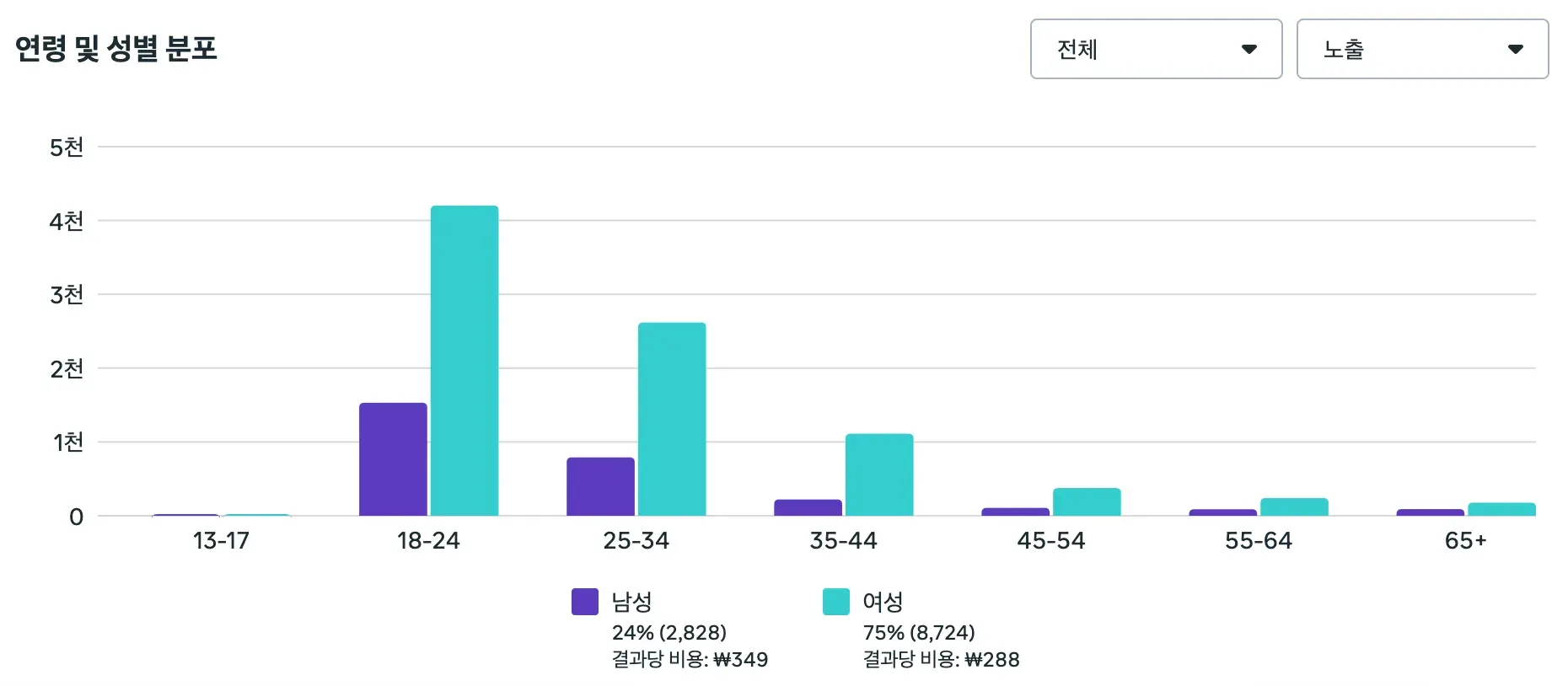나이트 근무자의 경우 CTR이 가장 높지만 도달률이 너무 작아서 확장하기 어렵다고 판단함. 또한 우리가 지정한 여성 타겟과는 달리 남성 타겟 노출 & 도달이 더 많아 방향성이 잘못되었음