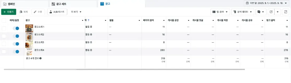 ํด๋ฆญ๋ฅ , CPC, ๋๋ฉํ์ด์ง ์ ์ ์ ๋ชจ๋ ์ฐ์.