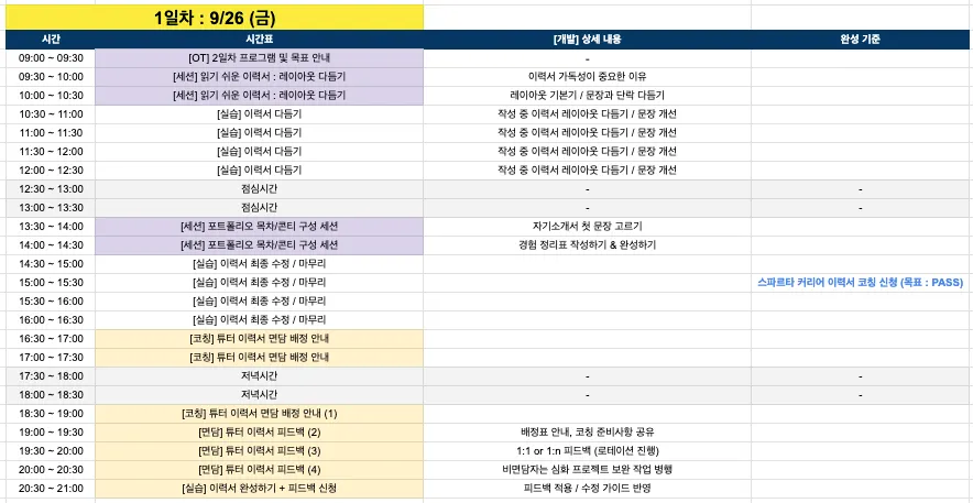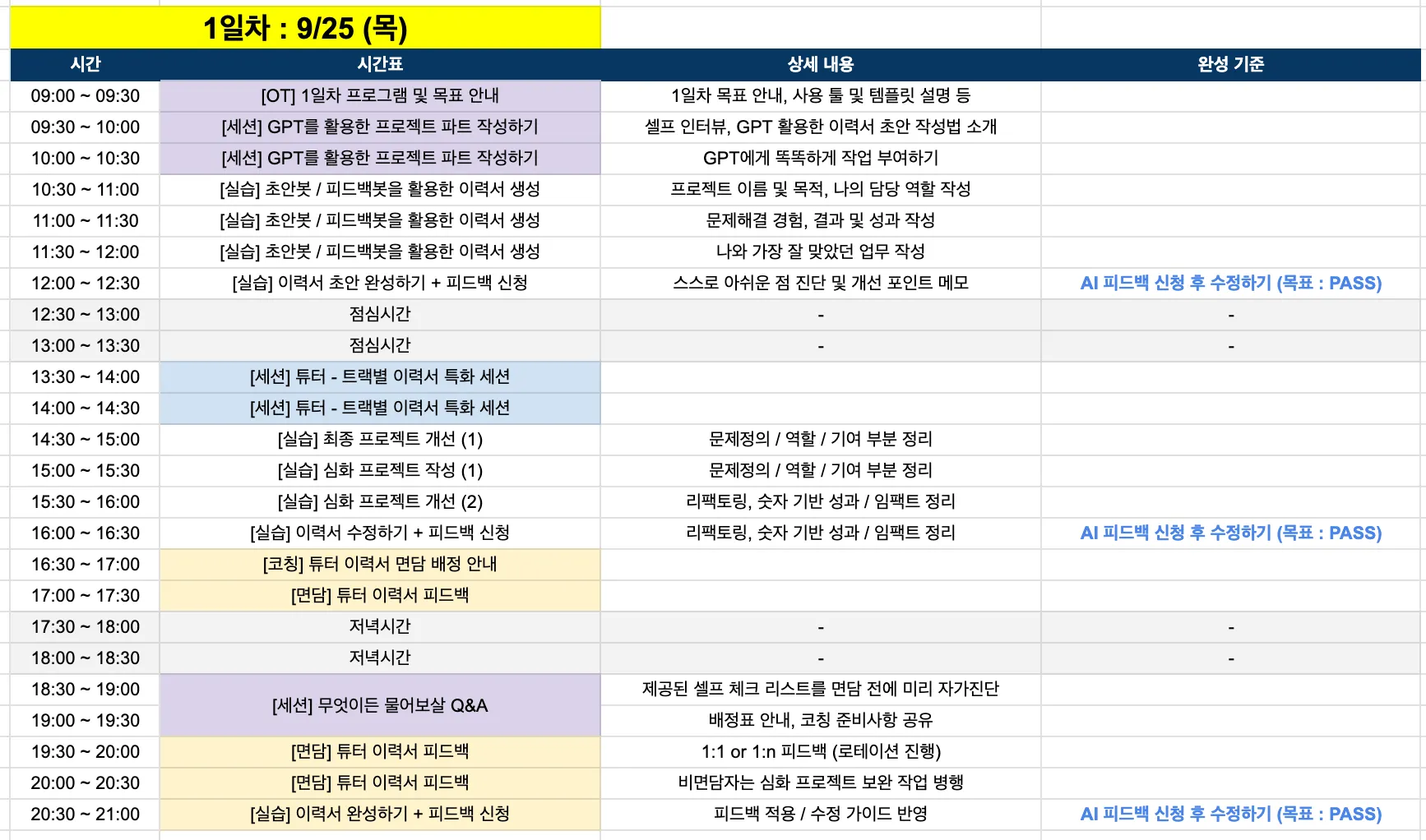 팀 당 20-30분정도로, 최종 프로젝트가 유의미한 포트폴리오가 될 수 있도록 상세한 피드백을 드릴 예정입니다.