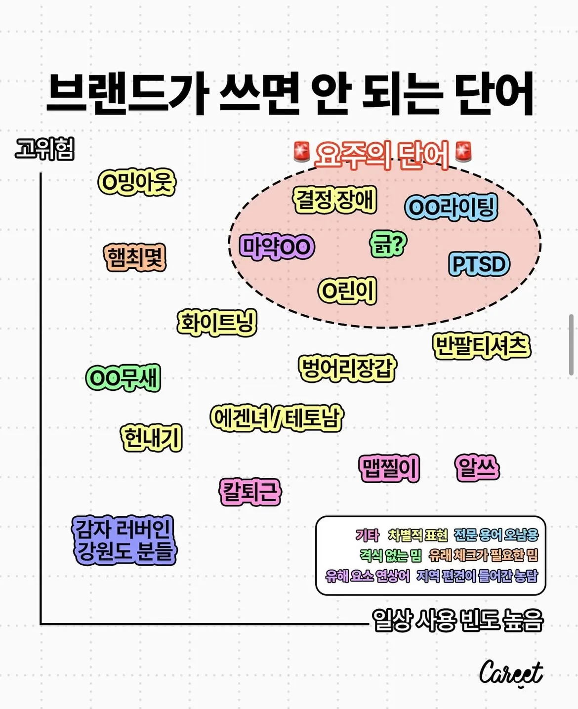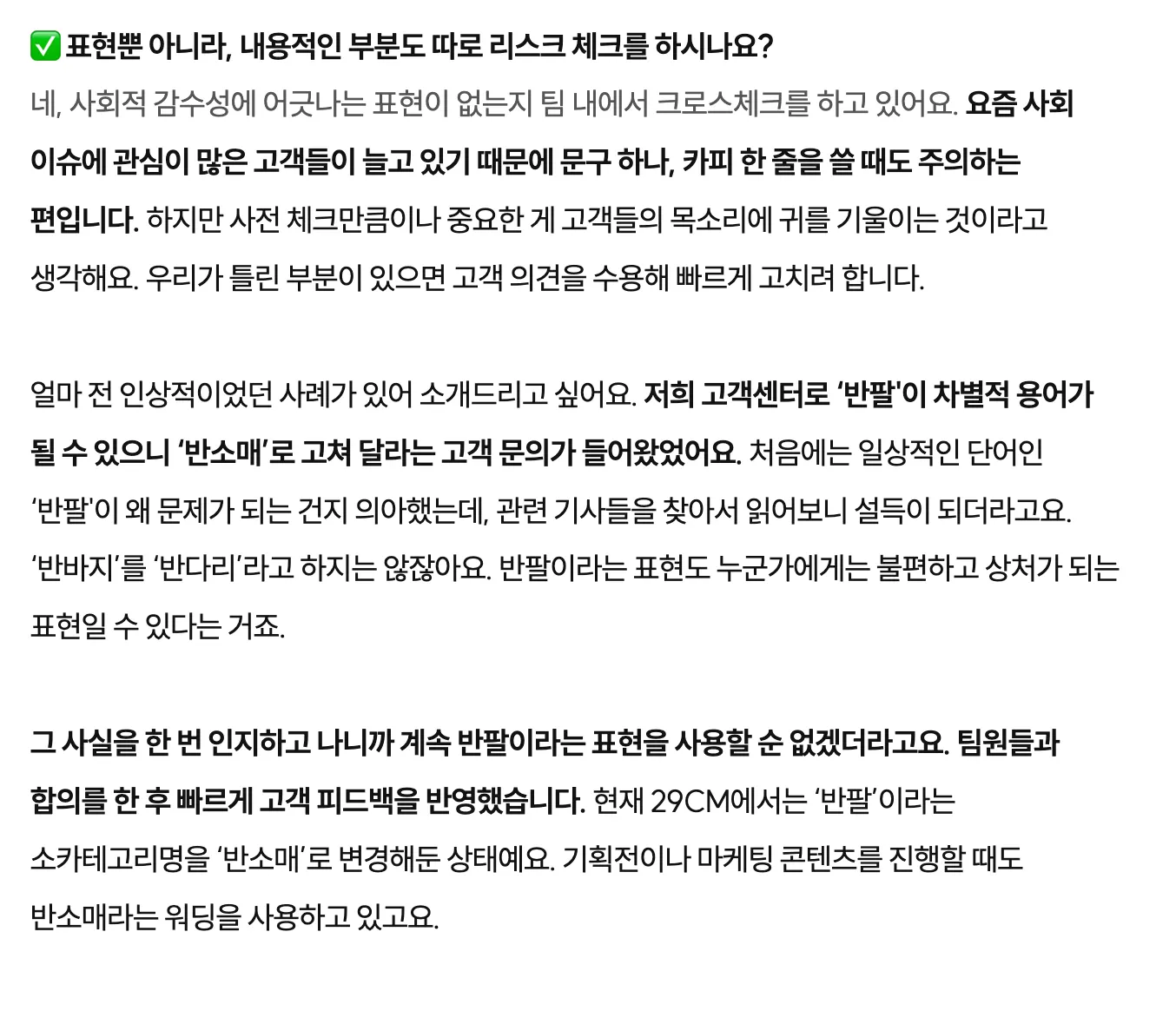 사회적 이슈를 담은 밈, 혹은 누군가를 배려하지 못하는 카피들이 이슈가 될 때마다 반응은 두 개로 나뉩니다. 너무 예민하다 혹은 듣는 사람을 고려해야 한다 등 다양한 논쟁이 오가죠. 법적 이슈처럼 정답을 딱 정할 수 없는 부분인만큼, 마케터 본인의 주관 및 판단이 중요하게 작용해요. 내가 작성한 메세지가 혹시 누군가에게 불편하게 들리지는 않을지 검토하고, 동시에 현업에 적용할 수 있는 범위를 판단하는 과정이 필요할 수 있어요. (ex. 반팔 - 반소매)