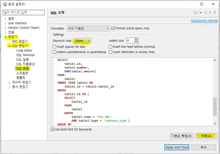 상단창 윈도우(w)→환경설정(p) 열고, 아래와 같이 설정.