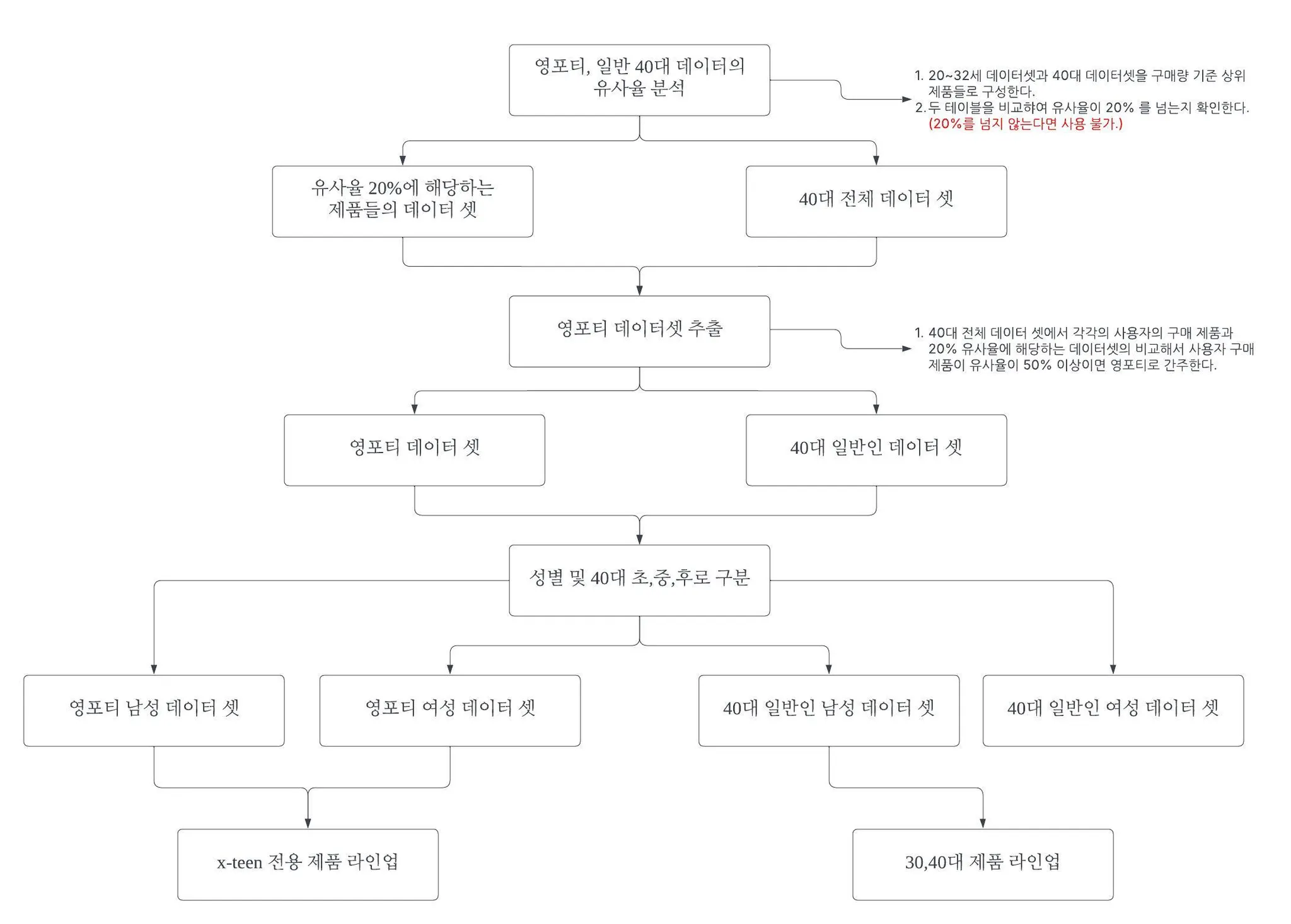 #최종 영포티 그룹 상위 2개 카테고리의 제품의 상위 5개 제품 추출, 일반 40대 그룹 상위 1개 카테고리의 제품 상위 10개 제품 추출 완료.