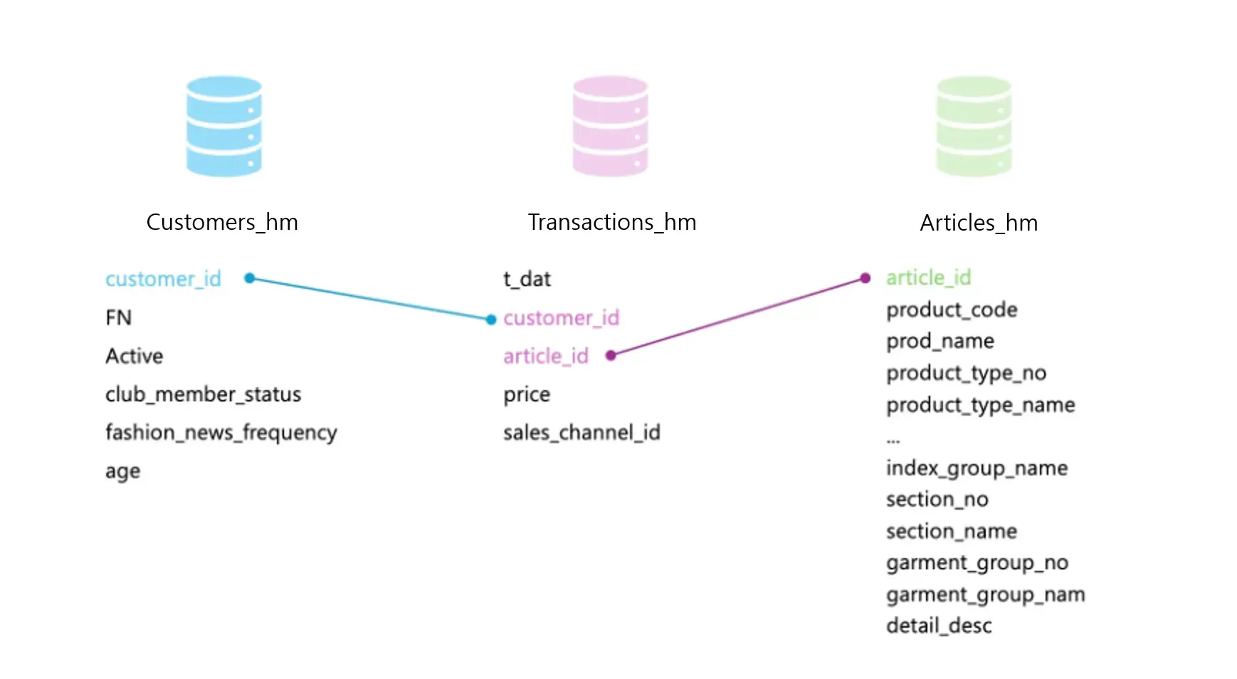 제공된 데이터는 고객(customers_hm), 거래(transactions_hm), 상품(articles_hm)을 기록한 대규모 커머스 데이터셋입니다.