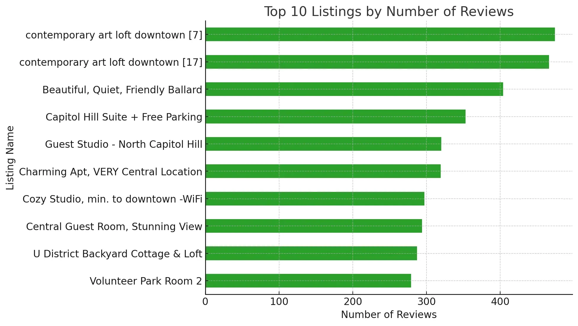 일부 숙소는 300~470개의 리뷰 보유 → 시장 집중 구조