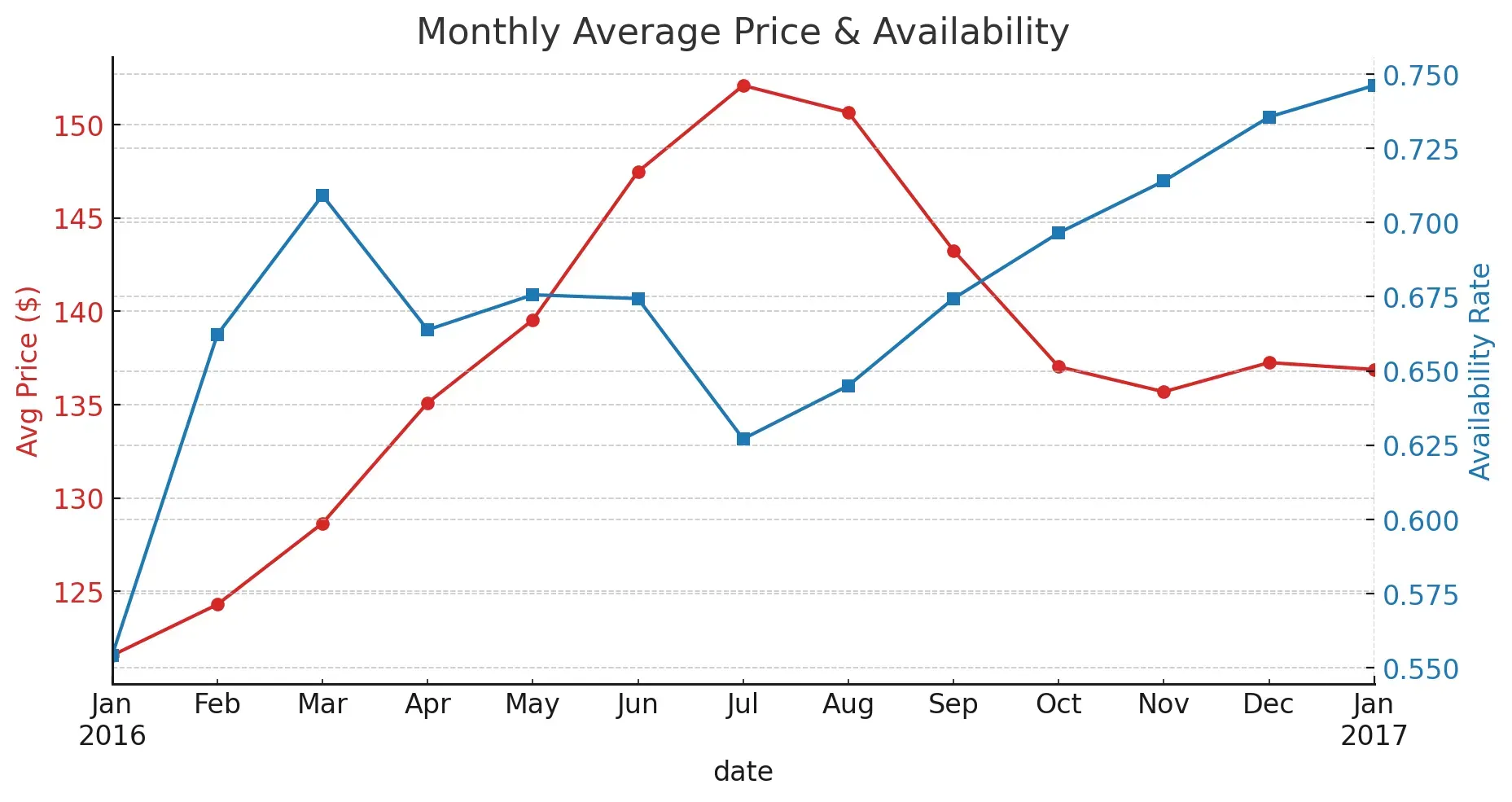 시간 흐름 분석 – 월별 가격 & 예약 가능률