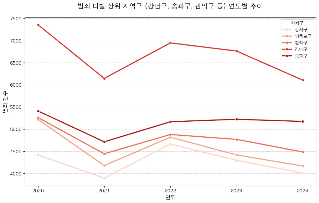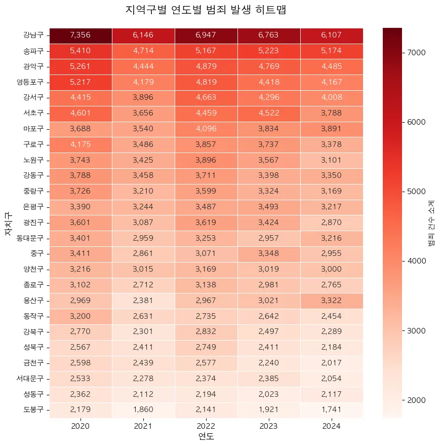 자치구별 연평균 5대 범죄 발생 건수(20~24년) - 5대 범죄: 살인, 강도, 강간/강제추행, 절도, 폭력