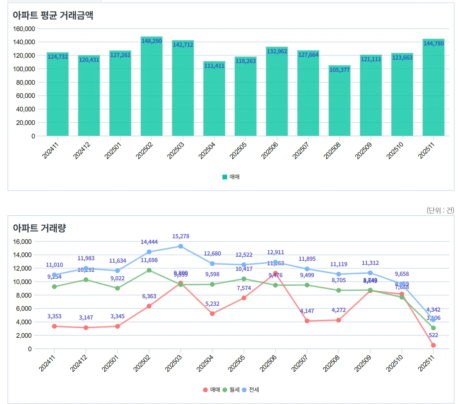 전년도 대비 거래 금액은 상승하는 추세아파트 거래량은 매매, 전세, 월세 상관 없이 급격하게 떨어짐-> 전체 거래는 줄었지만 평균 가격은 크게 증가했다는 것을 보고 고가 거래 중심으로 거래되었다는 것을 알 수 있음