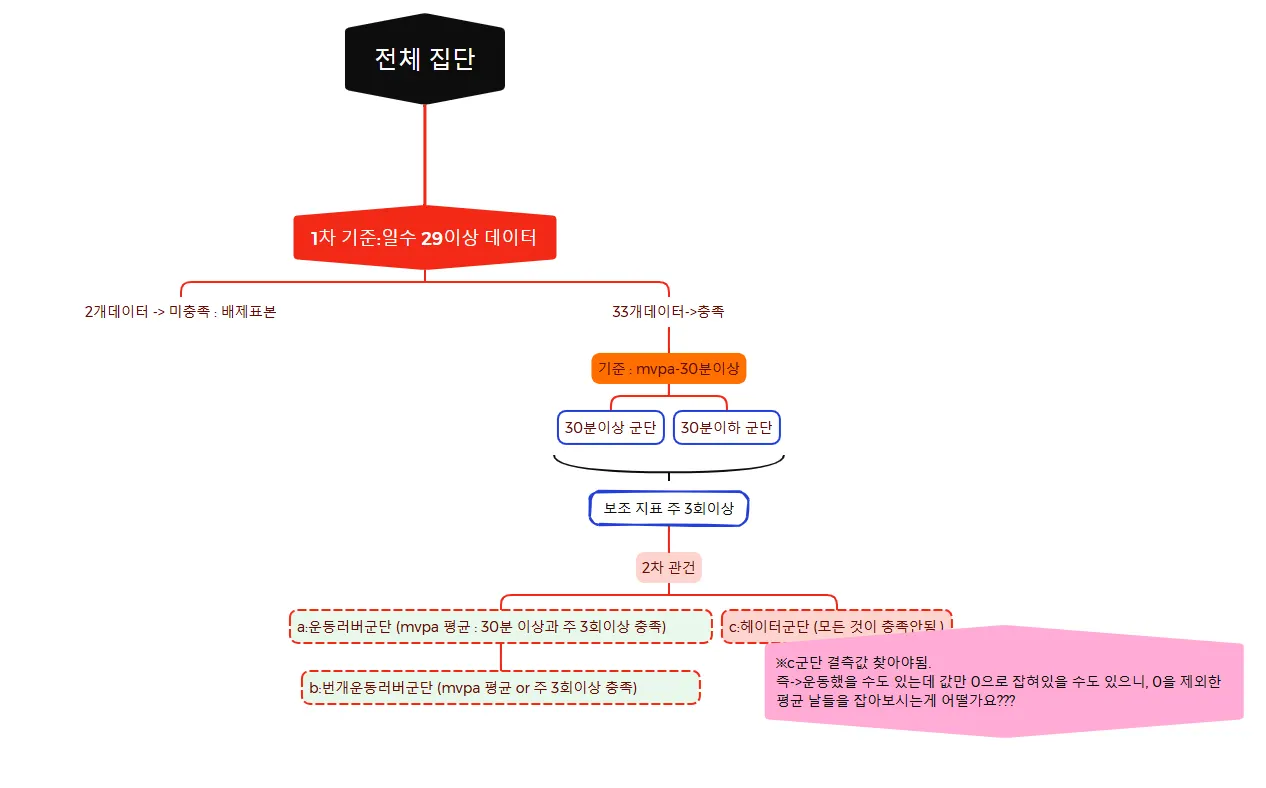 ~ [MVPA(강+중) 시간 일 30분 이상] OR ~ [(MVPA 30분 이상) 주 3회 이상 → 꾸준히 안 하는 사람