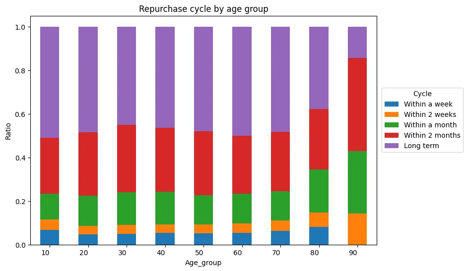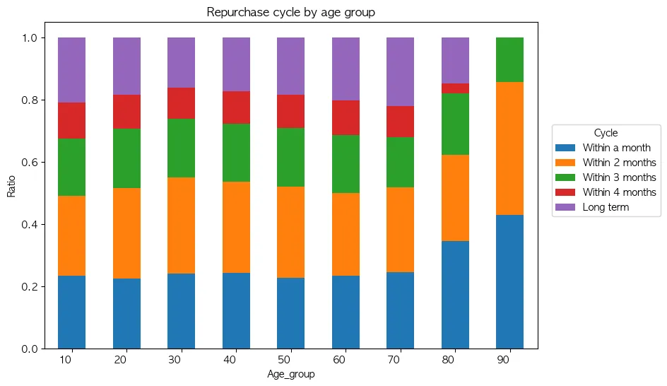 (+) # 연령대별 재구매 주기 섹션 나누어서 분석 (1주, 2주 한달, 두달, 장기로 구분)