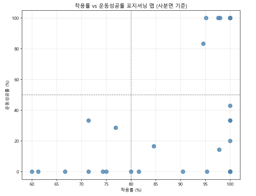 plt.title("착용률 vs 운동성공률 포지셔닝 맵 (사분면 기준)")