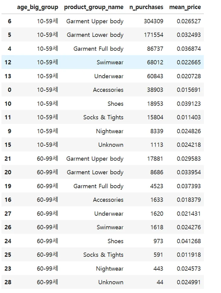 10-50대 vs 60-90대를 나누어 주로 구입하는 상품군과 평균가를 분석