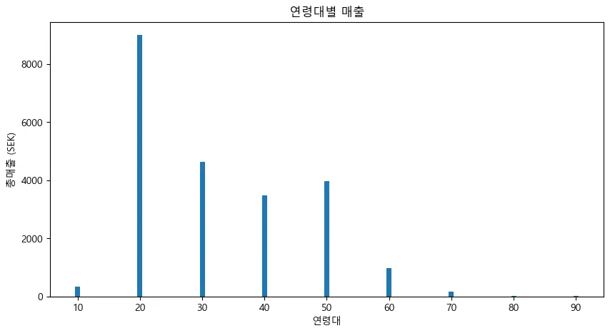 20대의 총매출이 두드러지게 높으며, 70, 80, 90대의 경우 매우 적은 모습