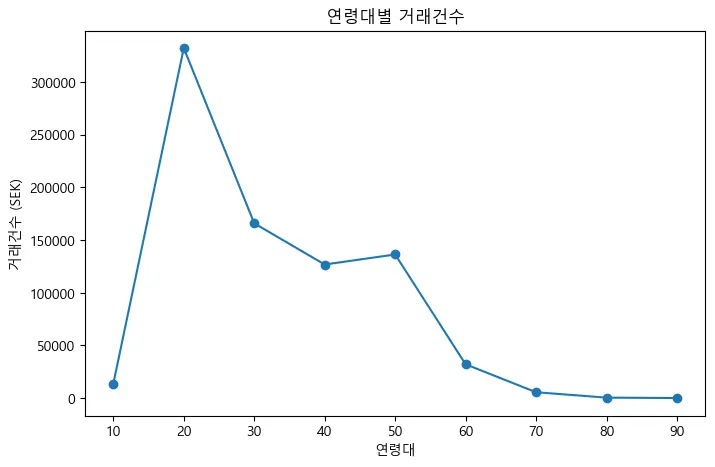 20대는 구매 빈도(거래건수) 기반 주력 매출 층, 3~50대는 그보다 낮은 빈도지만 비교적 높은 단가 상품을 선택하는 고단가 기여층으로 보임