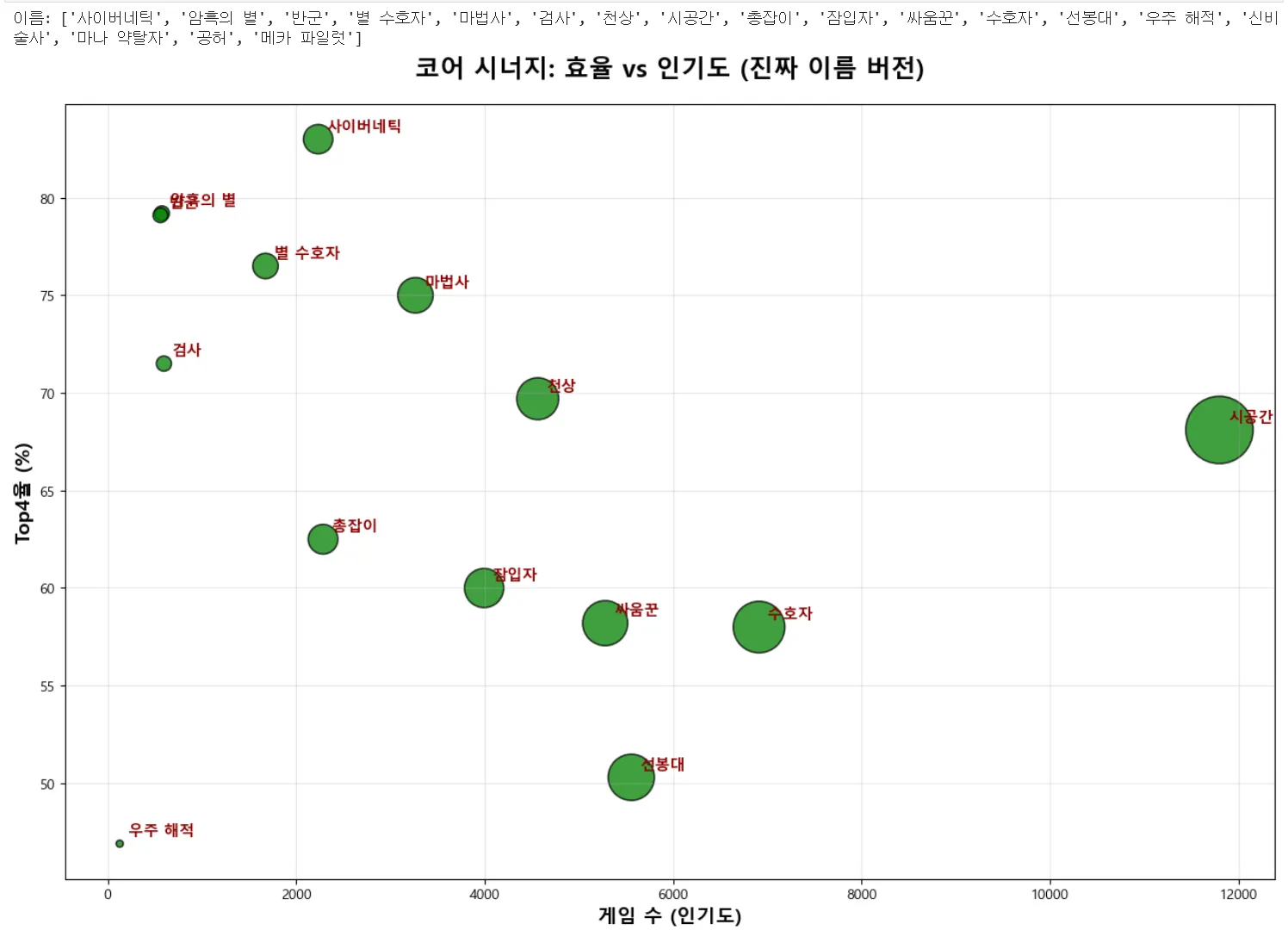 plt.title('코어 시너지: 효율 vs 인기도 (진짜 이름 버전)', fontweight='bold', fontsize=18, pad=20)