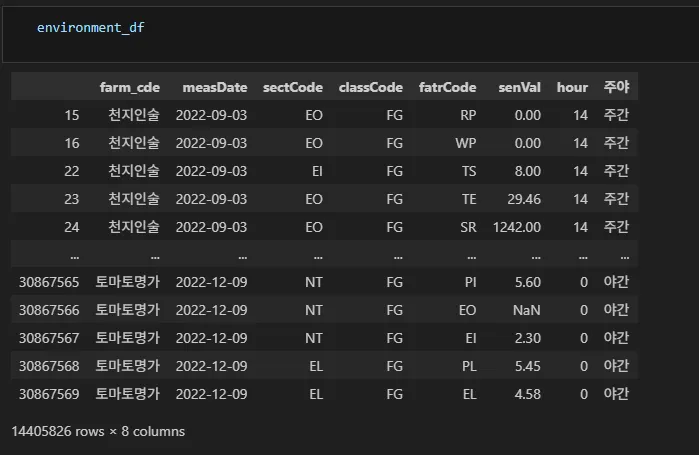 env_pivot3= (environment_mer3.pivot_table(index=['measDate','주야','farm_cde'],columns='FatrCode',values='senVal',aggfunc='mean').reset_index())