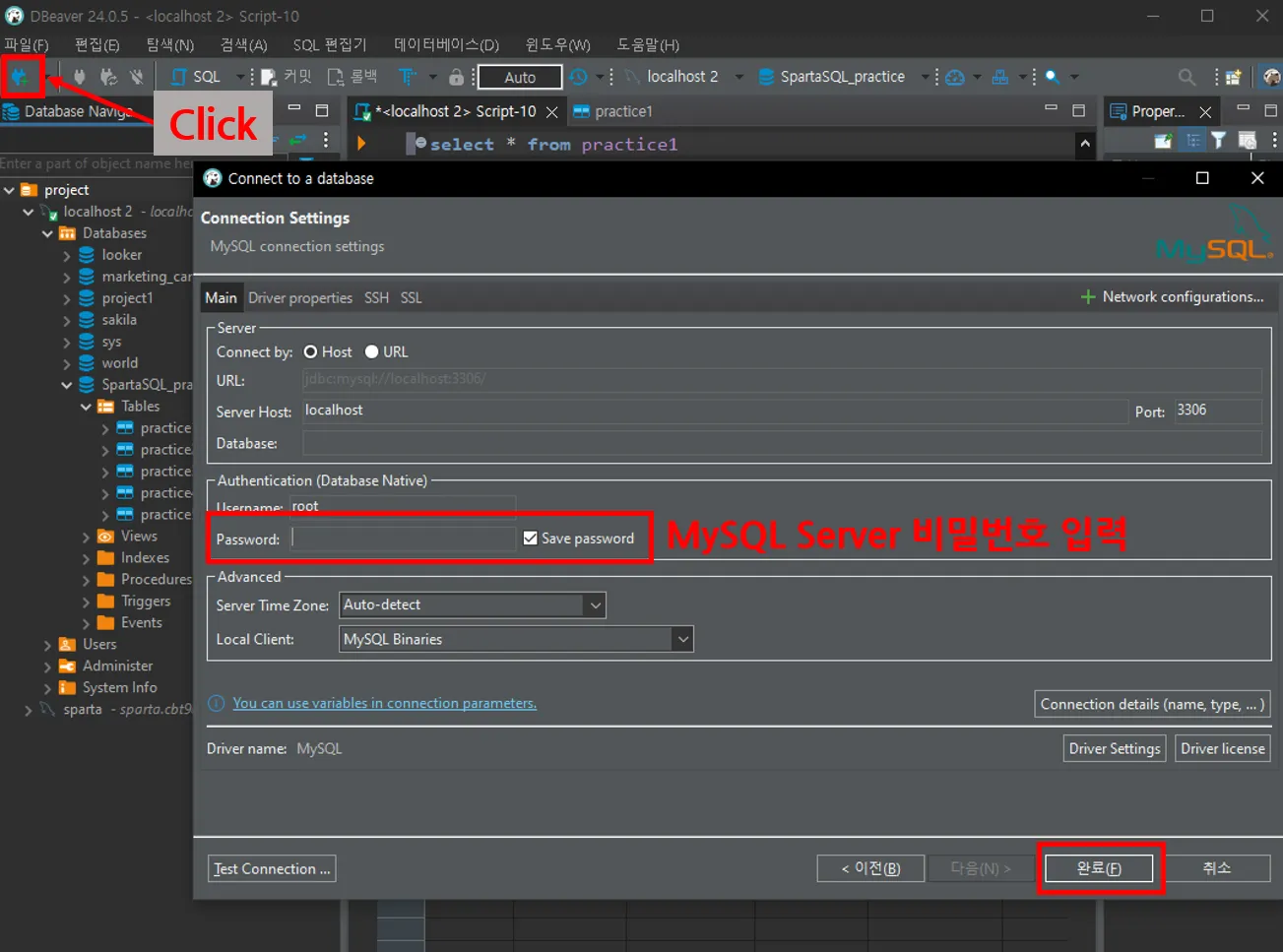 MySQL을 선택하여 root의 비밀번호를 입력하고 연결을 해줍니다.