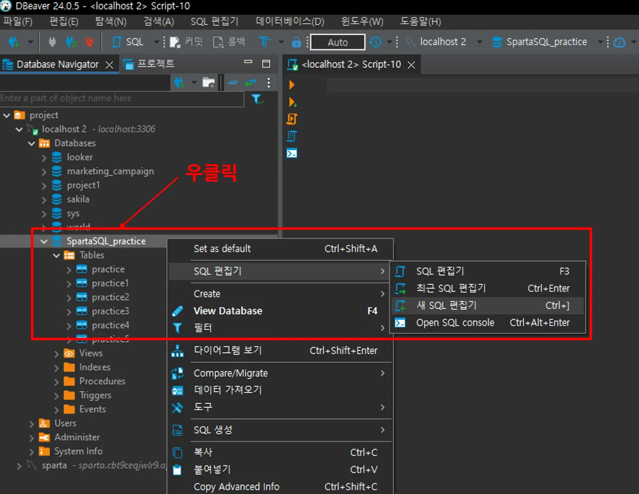 만들어진 데이터베이스를 우클릭!