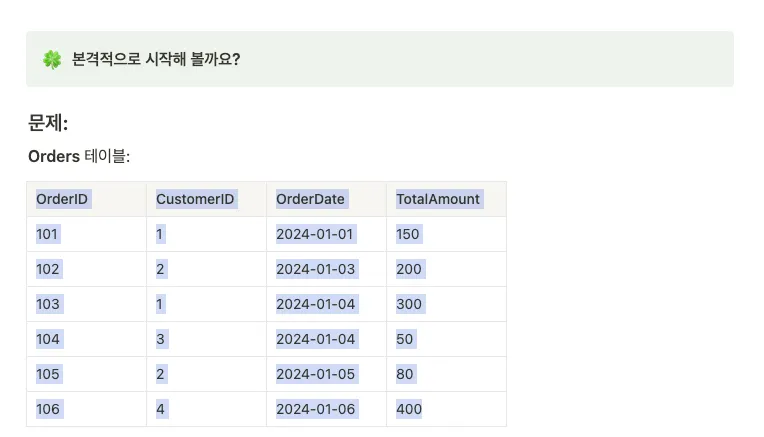 문제에 있는 데이터 테이블을 드래그하여 복사(ctrl + C, cmd + C ) 해주세요.