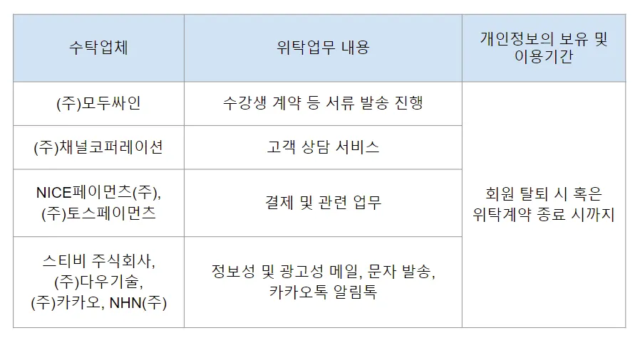 ② 회사는 서비스 향상과 효과적인 업무 처리를 위하여 다음과 같이 개인정보를 처리 위탁하고 있습니다.